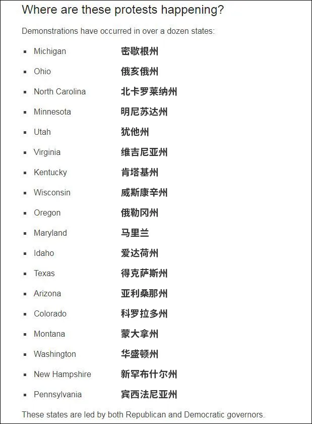 随着特朗普4月17日连发3推鼓动“解放明尼苏达州”;“解放密歇根州”;“解放弗吉尼亚州”,这样的抗议活动已经蔓延了美国东海岸到西海岸的十几个州。