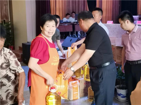 会后,王东庆经理把大米、油分发各个老人手中,东龙酒业六名工作人员纷纷投入到扶贫工作中。