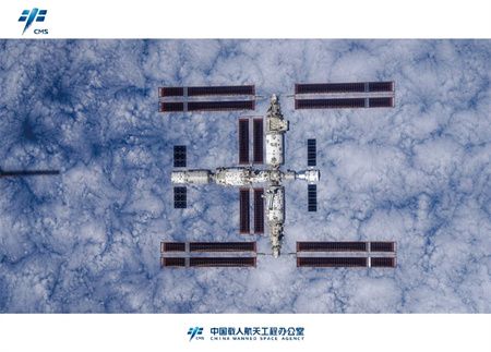 神舟十六号乘组返回地面前手持高清相机通过飞船绕飞拍摄的空间站组合体全景照片在由香港特区政府组织的载人航天工程代表团与媒体见面会上首次发布。这是我国首次在轨获取以地球为背景的空间站组合体全貌图像,也是中国空间站的第一组全构型工作照。