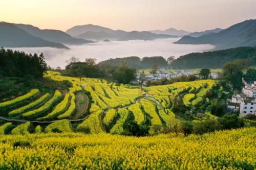 进入三月中旬以来,江西婺源的十万多亩油菜花竞相开放,正式进入了盛花期。迷人花海遍布每个村庄,风姿灼灼,景色迷人。在“中国四大花海”之一的江岭景区,漫山遍野的油菜花随着梯田弯曲的线条蜿蜒至远方,犹如金蛇舞动,蔚为壮观。在李坑、思溪延村等景区油菜花盛开于徽派建筑之间,与小桥、流水、人家构成了一幅娟秀柔美的江南春景图,引来了天南地北的游客赏花潮。