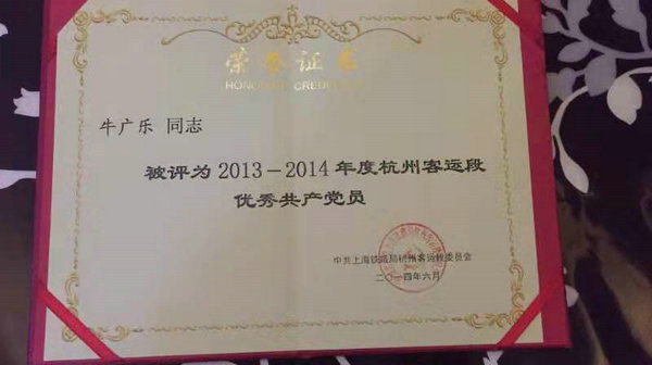 作为一名共产党员,老牛不管是在哪个单位都能够走在大部队的前面,以极其严格的要求来约束自己,他的品格得到了其他职工的一致好评,曾获得2013年度杭州客运段优秀共产党员和2020年度合肥客运段优秀共产党员的殊荣。