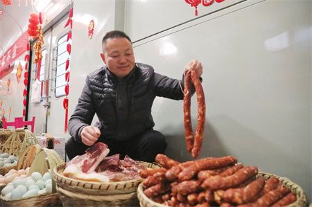 近日,在昆明至元谋西7466/7465次“慢火车”上,一场以“乡村振兴展现新气象 铁路帮扶情暖千万家”为主题的“年货街”活动开张。
