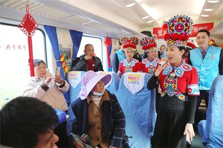 8时51分,列车从黑井站开出,车厢里的旅客又多了不少。“都说火车是流动的驿站,今天咱们这趟车也变成了流动的集市,我们还为大家准备了丰富的文艺活动。”随着主持人开场,铁路工作人员和青年志愿者打起手鼓,唱起《最炫民族风》,大家载歌载舞,车厢变成欢乐的海洋。