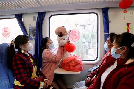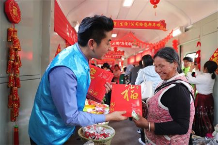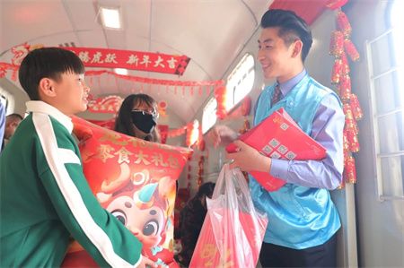 活动进行期间,青年志愿者还为旅客们送上了春联、福字,把新春的祝福传递到了车厢的每个角落。