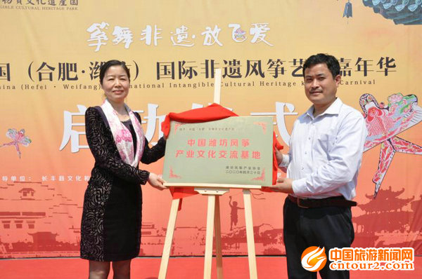 之后,中国风筝协会副主席王永训为中国非物质文化遗产园授予了“中国风筝产业文化基地”的称号。