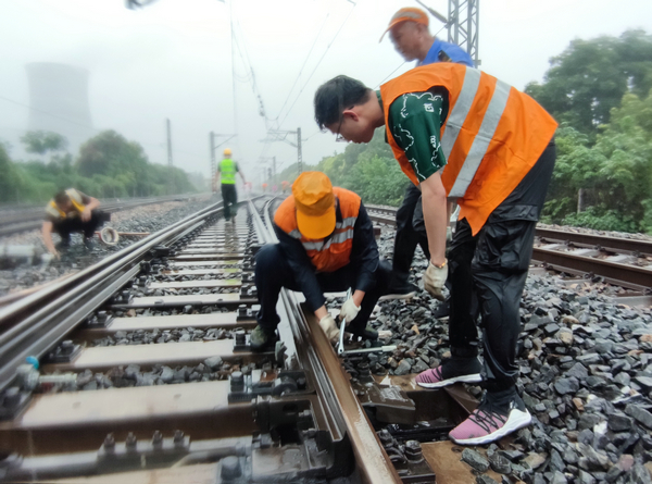 瓢泼大雨中锁闭道岔,确保列车安全畅通 (张明 摄)