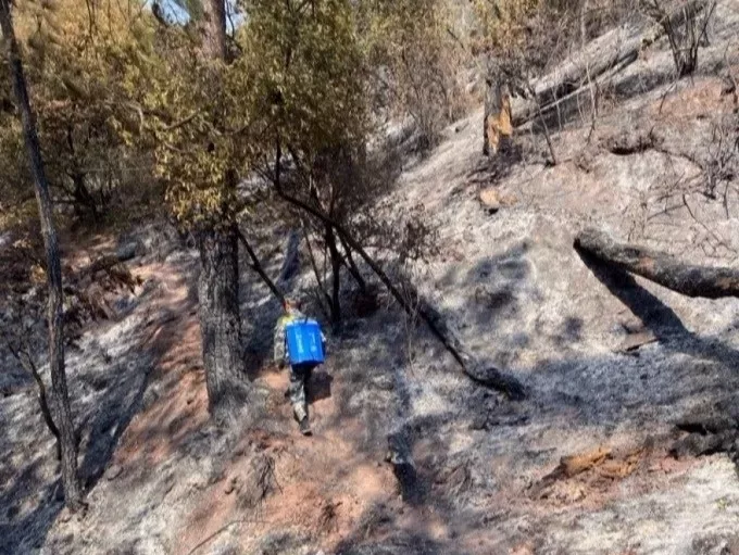 “上山扑灭随时可能复燃的火星,路上遇到了三次火情,但都被扑灭了”此次援助行动黄芸浩主要的工作是巡山和提灭火装备。