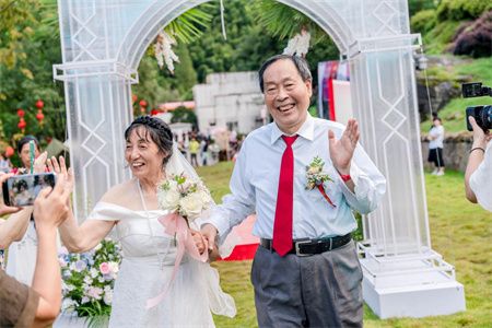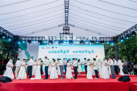 愿得一人心,白首不相离。在翡翠谷如茵的大草坪上,来自不同年代、不同行业的17对伉俪,伴随着浪漫的音乐,携手从“幸福门”缓缓步入会场中央,在父母亲友、游客媒体的见证与祝福下,许下相伴一生的诚挚诺言。