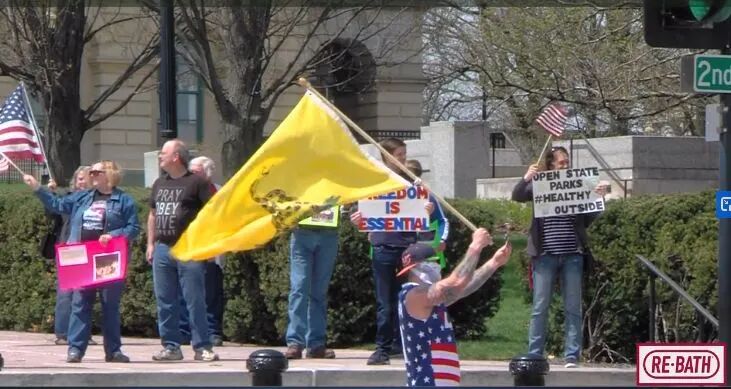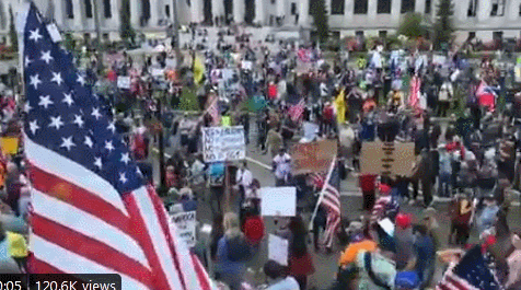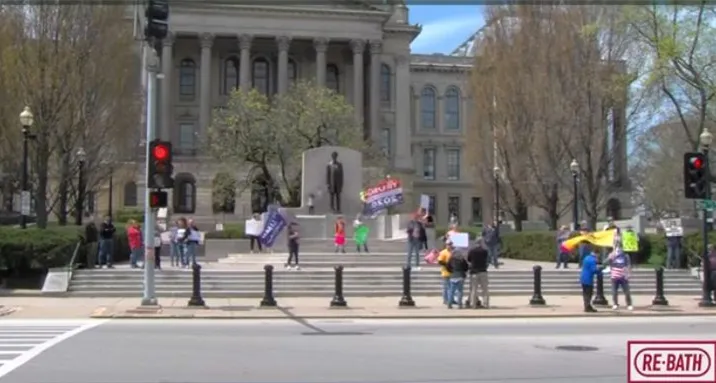 抗议活动的视频显示,人们聚集在国会大厦前,大多数都举着标语,没有戴口罩。驱车前来抗议的人则在车里举标语、按喇叭。