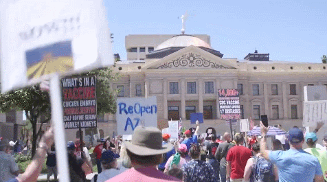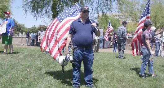 据《亚利桑那共和报》当地时间4月20日报道,当天,数百人聚集在亚利桑那州议会大厦附近,要求共和党州长道格·杜瑟(Doug Ducey)停止在家办公的命令。在现场,美国国旗和特朗普的竞选用品随处可见,人们涌进广场,然后穿过街道向州议会大厦游行,要求企业重新营业,允许员工重返工作岗位。