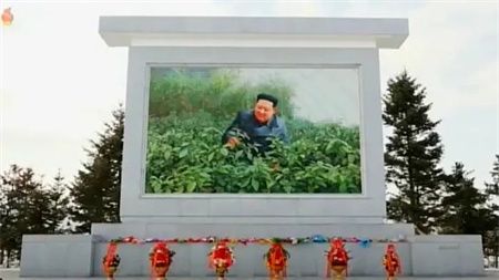 第二幅金正恩壁画位于咸镜北道中坪蔬菜温室农场,出现时间是在2023年2月8日KCTV的“庆祝建军节”综合新闻——中坪农场向金正恩壁画献花祝贺建军节;此幅壁画的建立时间不详。这幅壁画描绘的是2019年12月3日金正恩参加该农场建成投产仪式、在大棚里查看作物生长情况的场景,基本写实,只是做了背景处理。大家可以比较一下壁画和原型照片(下图)。