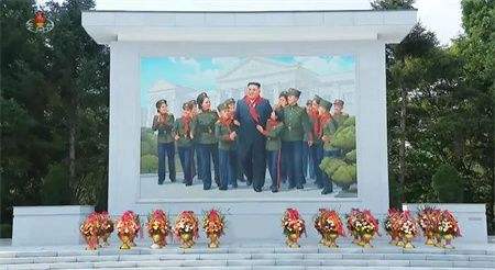9月17日,当金正恩尚在访俄的时候,一幅壁画在平壤万景台革命学院(以下简称万景台学院)举行了竣工典礼。这幅壁画描绘的是“敬爱的慈父金正恩元帅”亲临万景台学院建院75周年典礼现场,给学员们“以父亲般的亲切祝福的慈祥形象”。这幅壁画的名字叫做《把学员抱在温暖的怀抱里》(下图)。