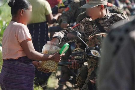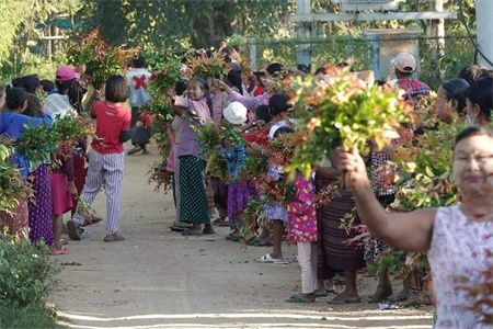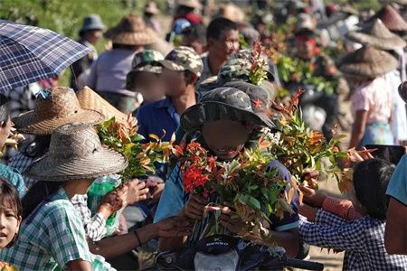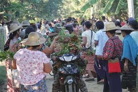 2023年11月24日黎明,缅甸共产党(CPB)人民解放军(PLA)第一军区和盟友联合对实皆省瑞波县耶乌镇အောင်သာယာ/Aungtharyar村的缅军、警察及骠索缇(Pyu Saw Htee)民兵营地实施攻击,造成缅军一方约10人死亡,15人受伤,7人被俘,革命战士们得胜归来后受到了当地民众的夹道欢迎,并在田间地头采摘野花为革命战士们献花。