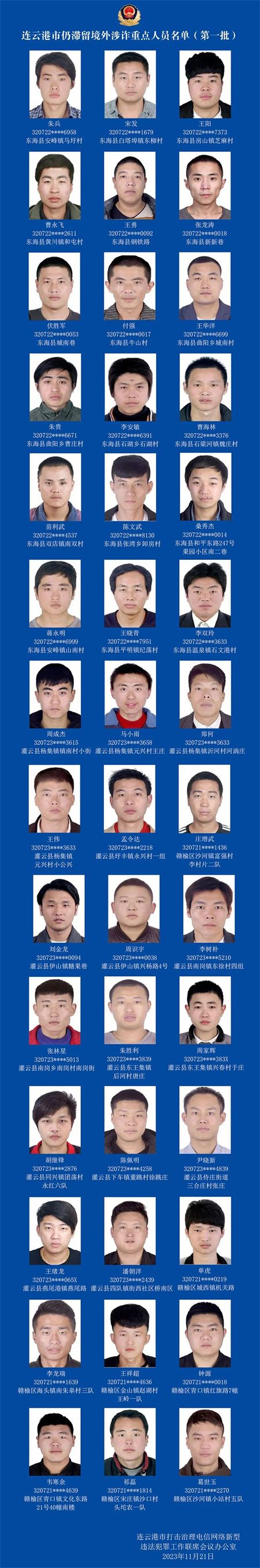 微信公众号“连云港警方”11月25日发布关于对非法滞留境外涉诈重点人员公开劝返的通告,公布首批42人劝返名单。