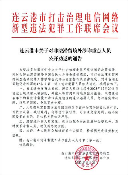 通告称,滞留人员应主动于2023年12月20日前通过正规渠道入境回国,并在入境前向户籍地派出所报备。未在通告名单中的非法滞留境外涉诈高危地区的连云港籍人员,勿心存侥幸心理,应尽早回国,争取宽大处理。
