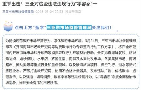 重拳出击!三亚对这些违法违规行为“零容忍”据三亚市市场监督管理局微信公众号消息,为持续规范旅游市场经营行为,净化旅游市场环境,3月24日,三亚市市场监督管理局印发《开展海鲜市场缺斤短两等消费欺诈行为专...[更多详细]