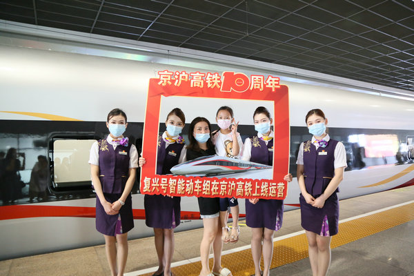 ▲6月25日,乘务员在上海虹桥站站台拉起横幅庆祝复兴号智能动车组在京沪高铁上线运行。姚佳 摄
