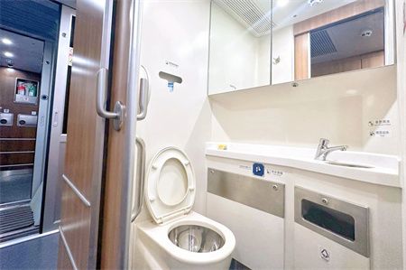 9号车厢为列车的无障碍车厢 配备轮椅固定带 紧急呼叫按钮和安全扶手 方便重点旅客使用 宽敞的无障碍卫生间 设有按压式水龙头 安全扶手等设备设施 无障碍卫生间 还设有婴儿护理台 方便携带婴儿出行的旅客使用
