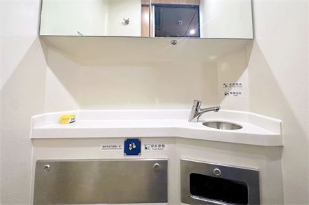 洗手间 卫生间和盥洗区 采用集成化设计 将便器、洗盆、面镜、垃圾箱等 服务设施集成于一体 整洁又便利
