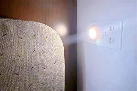 二等卧每个包间设置6张铺位 为半封闭式设计 与一等卧车厢相同 每个铺位均设有可调节光度 角度的阅读灯等设施 卧铺车厢里的柔光地灯 营造出高级舒适的氛围 进一步提升旅客夜间乘车舒适度 走廊中设有多个 回弹式折叠座椅、插座