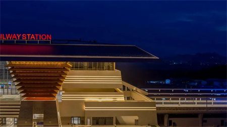 南宁北站新站房设计取材壮族风雨廊桥和绿城名片的元素,彰显南宁市“中国绿城”的风采,外部装饰提取壮锦、铜鼓等建筑织绣,融合了广西民族传统建筑工艺文化,进站口打造花海梯田绿化景观,让旅客拥有“月月有花、四季常绿”的候车体验。