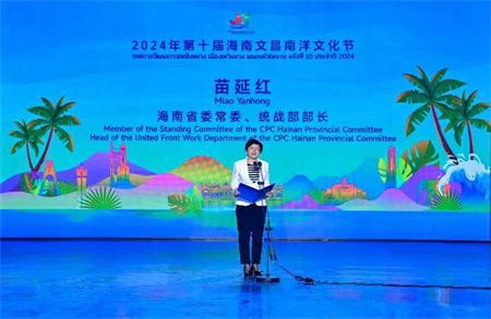 省委常委、统战部部长苗延红在致辞时表示: 海南文昌南洋文化节自2012年创办以来已经走过了十二个年头,举办了十届盛会,体现了乡情不断、根脉永续的家乡情怀。希望海南文昌南洋文化节成为赓续乡情的桥梁纽带,把世界各地的乡亲广泛汇聚起来、团结起来,把亲情与根脉延续下去,把力量与资源壮大起来;成为展示海南的重要窗口,把家乡的美好前景展示给乡亲们,也希望广大的乡亲们能够主动为海南发声,宣传海南,讲好家乡故事,讲好自贸港故事;成为凝心聚力的关键平台,把乡亲们凝聚起来,把力量汇聚起来,为海南自贸港建设凝心聚力、增智赋能。