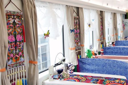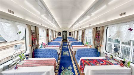 由中国铁路昆明局集团有限公司 全新打造的 云南首趟省内环线旅游列车线路产品 “象往号”旅游列车正式开行 开启为期11天的大美云南之旅 乘坐这趟列车的旅客 将从昆明出发 一路游览保山、丽江、香格里拉 大理、西双版纳等旅游胜地 从滇西北平均海拔3460米的 迪庆藏族自治州 到滇南平均海拔1100米的 西双版纳傣族自治州 从温暖春城到雪域高原 从皑皑雪山热带雨林 11天的行程 坐着火车便能感受到 云南复杂多样的地形地貌 以及立体气候所造就的独美风景 列车外观 列车内部也进行了装饰,使用全新的卧具、备品,使旅游列车从简单的“行”“住”功能,转变为云南旅游文化形象的流动载体和窗口,让旅客一踏上列车,就有不一样的体验。
