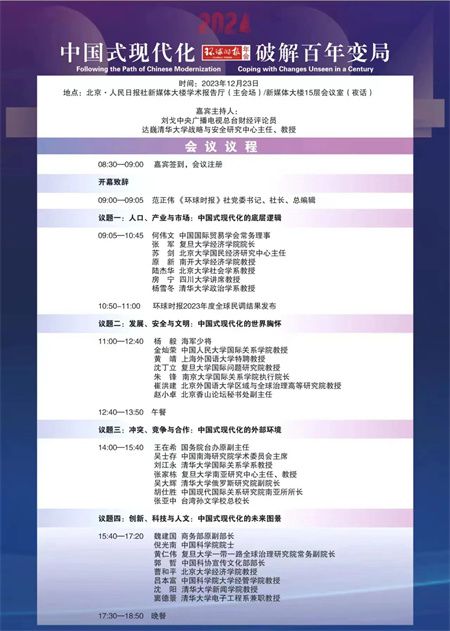 环球时报社党委书记、社长、总编辑范正伟在年会开幕式上发表题为《用思想之光照亮我们共同的未来》的致辞。范正伟表示,今天,世界之变、时代之变、历史之变正以前所未有的方式展开。在这样的背景下,选择“中国式现代化”作为今年环球时报年会的主题,正是因为只有把推进中国式现代化作为最大的政治,正确理解和大力推进中国式现代化,才能更好地应对风险挑战、把握战略机遇,在百年未有之大变局中牢牢掌握发展主动权。 范正伟说,环球时报年会已经连续举办了13届,成为读懂中国、了解世界的一个窗口,成为中国学术界、媒体界的一场盛会。这13届年会,也见证了中国式现代化道路逐渐清晰的过程。他表示,讲好中国式现代化故事,主流媒体责无旁贷。对环球时报来说,坚持守正创新、坚守媒体担当,就要努力提升思想含量,做中国式现代化的理论阐释者;展现文化底蕴,做中国式现代化的文明传播者;汲取源头活水,做中国式现代化的故事讲述者。 2024环球时报年会共设置“人口、产业与市场:中国式现代化的底层逻辑”“发展、安全与文明:中国式现代化的世界胸怀”“冲突、竞争与合作:中国式现代化的外部环境”以及“创新、科技与人文:中国式现代化的未来图景”四大议题,从不同角度探讨中国式现代化的重大理论与实践意义。当日,环球时报舆情调查中心还发布了2023年度全球民意调查数据。 24日,2024环球时报年会生命健康分论坛也将在京举办,主题为“中国式现代化,人人享有健康”。来自医药领域的政府人士、资深医者和权威学者就“传承、创新与融汇:传统医药的中国智慧”与“同美、共生与宜养:美好生活的中国愿景”两大议题展开讨论,并举办“‘人人享有心理健康’的中国实践”主题论坛。 (环球时报新媒体)以“中国式现代化 破解百年变局”为主题的2024环球时报年会12月23日在北京举行。百余位来自国内外的各界人士、专家学者围绕“中国式现代化”这一关键词进行分享与讨论。人民日报社副总编辑方江山出席。