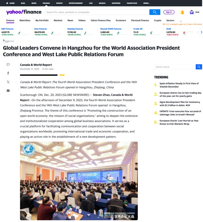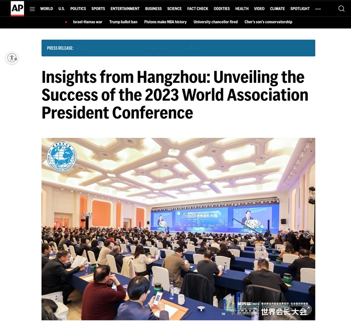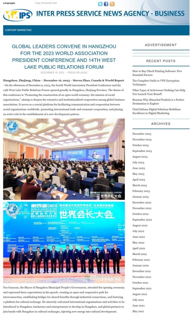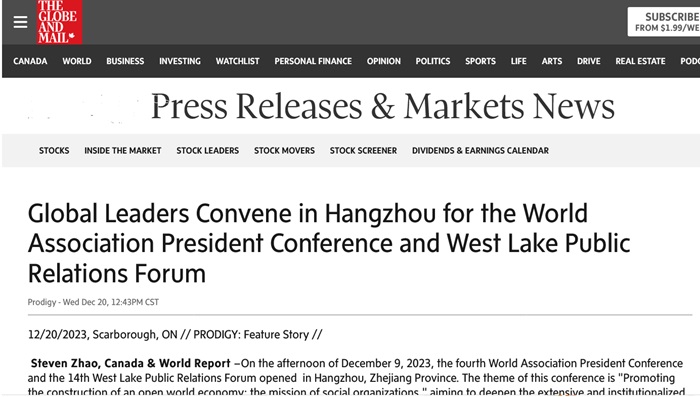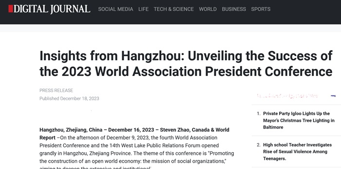 Hangzhou, Zhejiang, China – December 16, 2023 – Steven Zhao, Canada & World Report –On the afternoon of December 9, 2023, the fourth World Association President Conference and the 14th West Lake Public Relations Forum opened grandly in Hangzhou, Zhejiang Province. The theme of this conference is “Promoting the construction of an open world economy: the mission of social organizations,” aiming to deepen the extensive and institutionalized cooperation among global business associations. It serves as a crucial platform for facilitating communication and cooperation between social organizations worldwide, promoting international trade and economic cooperation, and playing an active role in the establishment of a new development pattern.