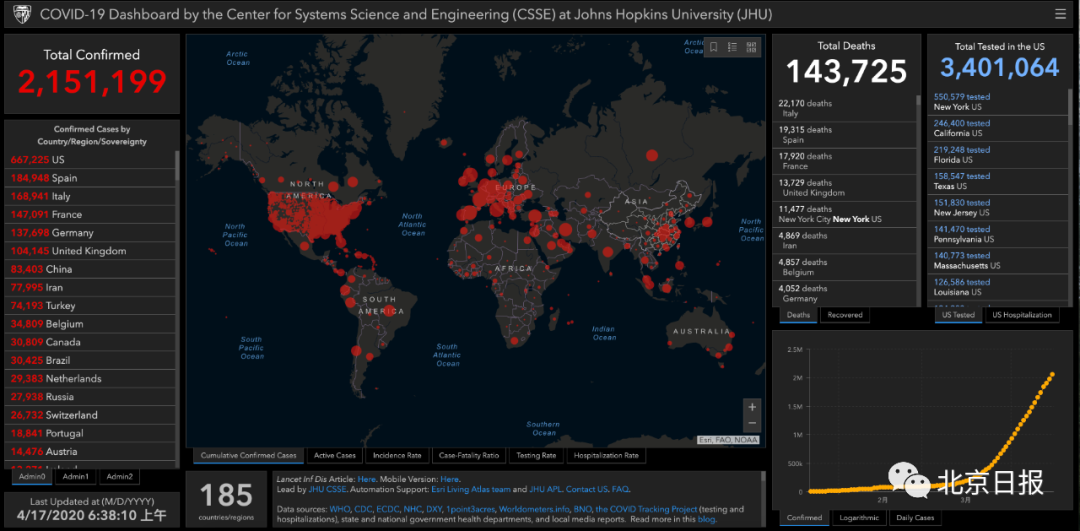 世界新闻网讯:据美国约翰逊·霍普金斯大学统计,截至北京时间4月17日6时38分左右,全球确诊人数突破215万例,达到了2151199例;全球死亡人数突破了14万例,达143725例。