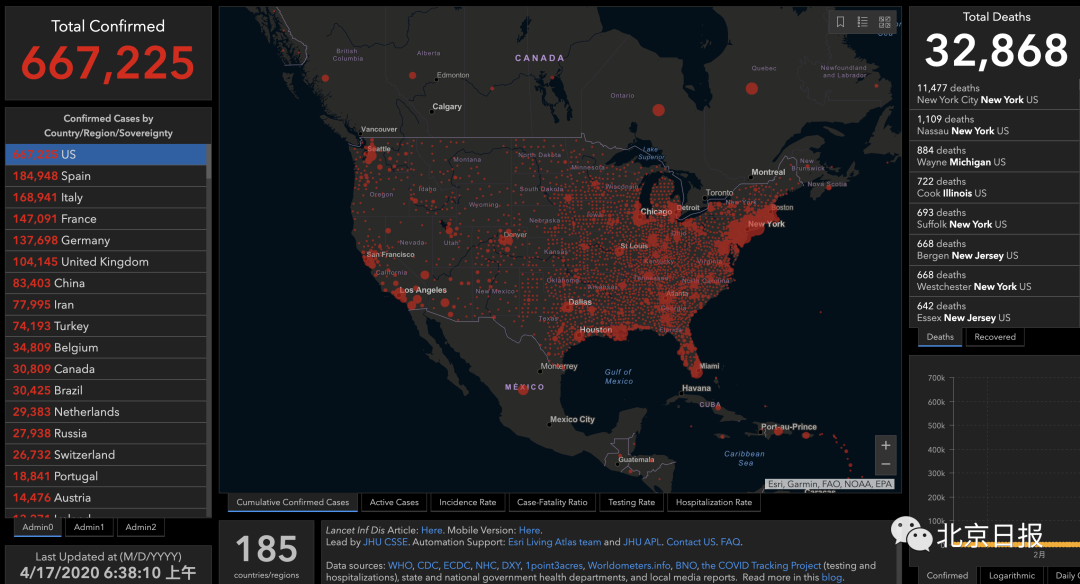 据美国约翰斯·霍普金斯大学发布的全球新冠肺炎数据实时统计系统,截至4月17日6时38分,全美共报告新冠肺炎确诊667225例,死亡32868例。数据显示,16日美国单日死亡人数创下了新高。