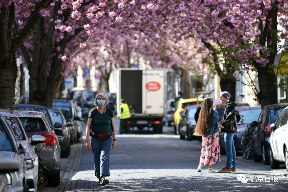 4月7日,在德国波恩,一名戴口罩的女子从盛开的樱花旁走过。(新华社发,乌尔里希·胡夫纳格尔摄)