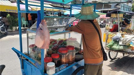 一名来自柬埔寨波罗勉省菩威县的男子,通过在金边市街头推车卖水果小吃,每天能够获得高达10万到15万柬币的日收入。