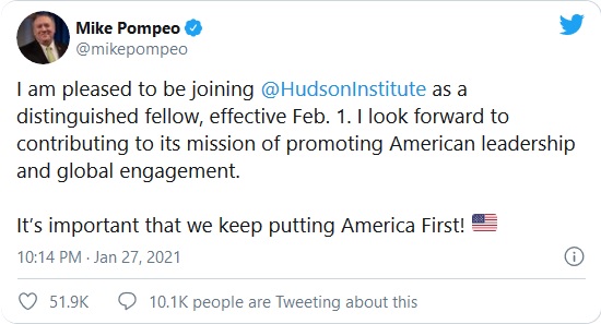 蓬佩奥在写给哈德逊研究所的一份声明中称:“我很高兴加入哈德逊研究所,并期待着为其促进美国领导力和全球参与的使命做出贡献。”