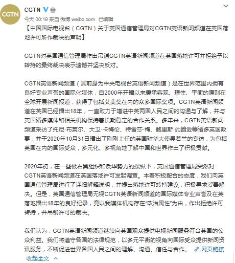 中国国际电视台(CGTN)关于英国通信管理局对CGTN英语新闻频道在英国落地许可所作裁决的声明