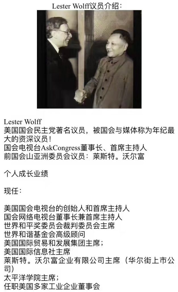2019年时值中美建交四十周年,美国国际产业投资总商会一行拜望原美国驻联合国大使、中美建交的友谊奠基者、美国国会民主党著名议员LesterWolff。当年是他100周岁生日,在其美国长岛家中共进晚餐。LesterWolff老先生精神矍铄、思维敏捷,家中充满了满满的中国元素,1979年访问中国,与时任国务院副总理的邓小平友好交流,也曾十几次到过四川成都等地方。