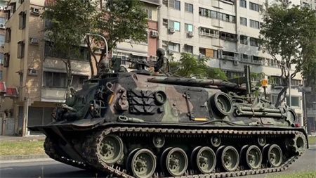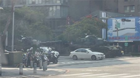 “东森新闻网”描述称,民众驾车行驶在高雄街头,对向迎面而来的居然是全副武装的军用装甲车。仔细观察后发现车顶架起机枪,坦克上有三名全副武装的台军士兵全程戒备。除装甲车以外,还有战车在马路上行驶,扬起大量沙尘,吸引民众目光。