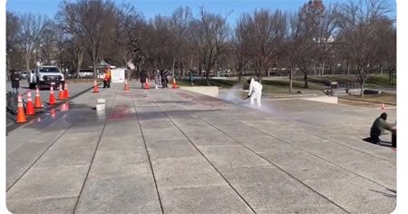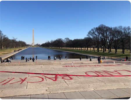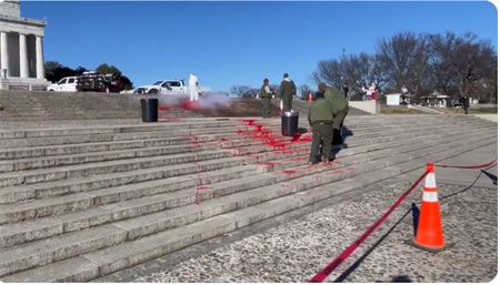 林肯纪念堂外被红漆涂鸦,工作人员正进行清理。图自社交平台X