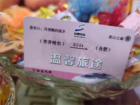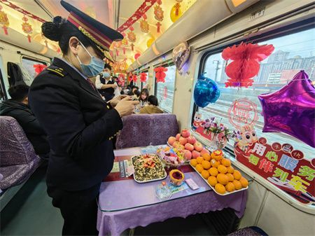 据悉,这次列车春晚车队全体干部职工都非常重视和期待,总支书记汪金夫特意向段党委提报申请,春晚节目更是严格把关,把传统的东北特色、东北美食、民族风情带到列车上。“女士们,先生们,欢迎您乘坐由齐齐哈尔开往到合肥方向的T244次列车,今天是我们传统节日——除夕,老话讲叫过三十儿,在这个特殊的节日里,齐客合肥车队第4乘务组全体工作人员诚邀您来6号车厢,与我们共同守岁过新年,让我们把这份团圆带给您,祝您龙年大吉大利”。列车长高唱、郑刚在巡视车厢过程中,逐车进行宣传。一首代表东北人的家乡歌曲《大东北》拉开正场晚会的序幕。旅客非常热情,掌声此起彼伏,热闹非凡。 “一年有365个日出,我送你365个祝福”车队副队长张鑫一边唱着歌一边把班组准备的小福字送给现场旅客,寓意“兜”里揣福。