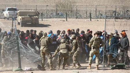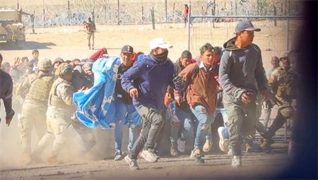 报道称,春季移民潮正涌向美国南部边境,他们希望在美国获得庇护。最新视频显示,大批非法移民聚集在铁丝网外,其中一些人拉破围栏制造了一个可以进入的缺口,5名国民警卫队成员则举枪试图阻止移民潮前进。被枪口对准的移民们最初举起双手停下,但过了几秒钟后,他们将国民警卫队成员撞倒,突破了防线。