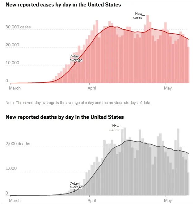 美国每日新增确诊与死亡病例数变化 图表来源:纽约时报