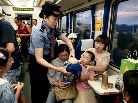 世界新闻网安徽讯(记者周淮民/文图黄德忠、崔晓庆)今年铁路的暑运工作已经过半,合肥客运段北京一车队“女子三八红旗包乘组”列车长刘永慧为了更好的为旅客服务,开展了各种便民服务措施,为繁忙紧张的暑运工作增添了一份温暖的色彩。