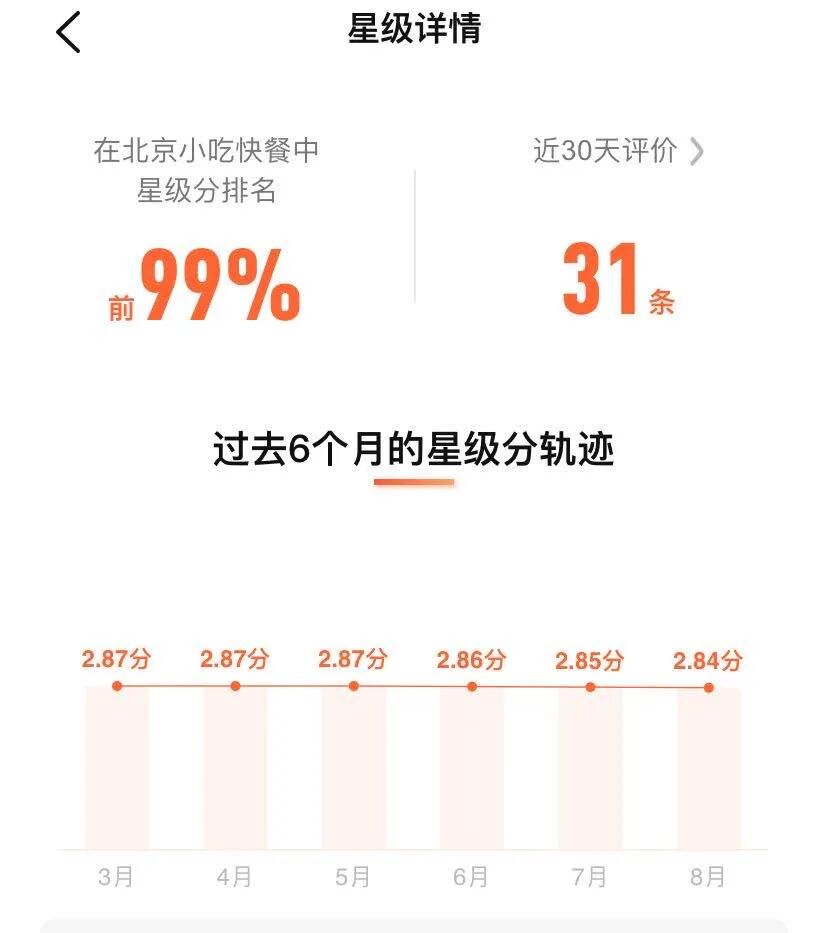 视频内容里,博主是根据大众点评上的差评排行来筛选餐厅。根据大众点评App显示的信息,狗不理包子(王府井总店)过去6个月的星级评分在2.84分-2.87分之间(满分为5分),这个成绩在北京小吃快餐中星级分排行前99%,即近乎垫底。