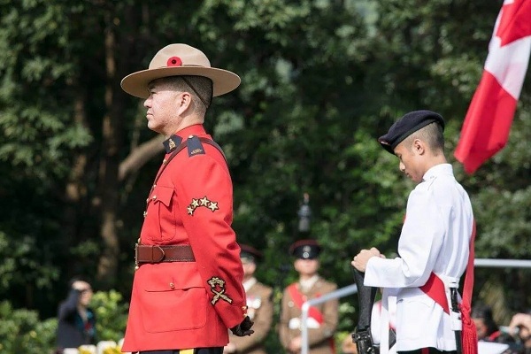 纪念加拿大军队在1941年香港战役中的牺牲者的年度仪式是一件庄严的事情。但2017年12月3日的纪念仪式中,这位站在纪念碑前低着头的华裔加拿大军官的出现成为一个很受欢迎场景,他与包括后来成为安省省长的凯瑟琳·韦恩等客人混杂在一起,并与老兵及其家属合影。