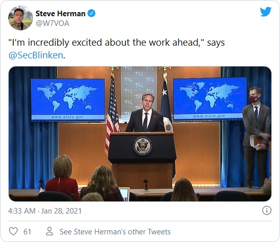 布林肯早些时候在与国务院工作人员见面时说,“全世界都需要”美国的领导,他将“重视”与盟国和伙伴的外交合作,以应对共同的挑战。这些问题包括“大流行病、气候变化、经济危机、对民主的威胁、争取种族的斗争以及(美国的对手对)我们的安全与全球稳定构成的威胁”。