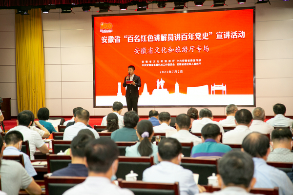 世界新闻网讯 (记者 周淮民) 为庆祝中国共产党成立100周年,深入开展党史学习教育,7月2日,由安徽省文化和旅游厅、安徽省委宣传部、安徽省直机关工委、安徽省退役军人事务厅联合主办的“百名红色讲解员讲百年党史”宣讲活动安徽省文化和旅游厅专场成功举行。安徽省委党史学习教育第六巡回指导组组长、省档案馆馆长黄玉明、安徽省委党史学习教育第六巡回指导组副组长、华安证券股份有限公司党委副书记、董事陈蓓、安徽省文化和旅游厅党组书记、厅长袁华出席本次宣讲活动。