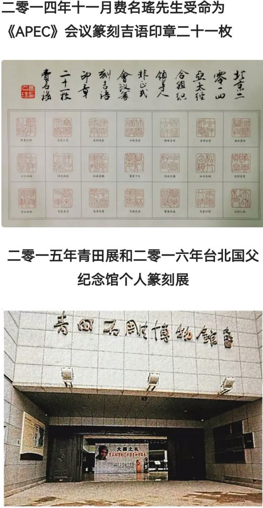 国内的《西泠印报》、《文汇报》、《新民晚报》、香港《大公报》和西泠印社出版的《现代印选》等,均先后以专题介绍或专栏作品予以刊登。在国外, 1985年,应日本《日本与中国》媒体之邀四次参加“日创展”, 获得了第九届金鹰奖牌。1993年,为韩国治“大韩民国第十四代大统领金泳三印”, 印作后在韩国多家媒体介绍引起不小的轰动。2000年,德国《文艺作品年刊》刊其十七方印拓以专题介绍。2006年,费名瑶先生创作了最精典的大作“千字文”, 也是篆刻家首次镌刻“千字文”, 在篆刻界引起了极大的轰动。2014年11月,受命为“APEC会议组织”篆刻吉语印章二十一枚。2015年和2016年分别在浙江的青田及台湾“台北国父纪念馆”举办个人篆刻展。2021年元旦,费名瑶篆刻“百名先烈英模名印”参加了上海文史馆与民盟上海市委在龙现代艺术馆举办的专题艺术展。