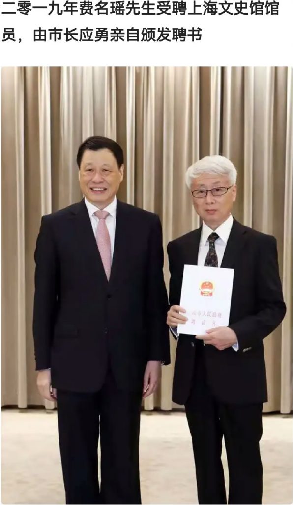 由于费名瑶所取得的成就, 2019年被上海市政府聘为上海文史馆馆员,并由市长应勇先生亲自为费名瑶先生颁发聘书。