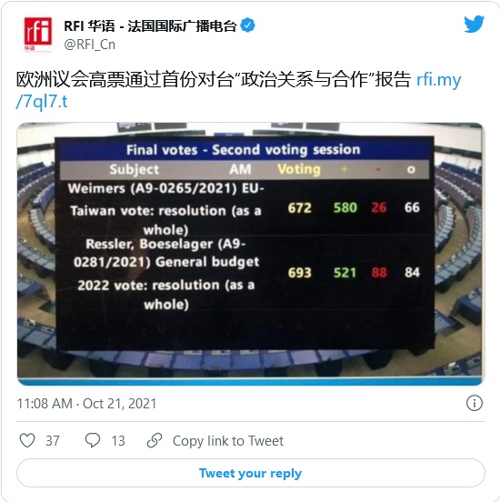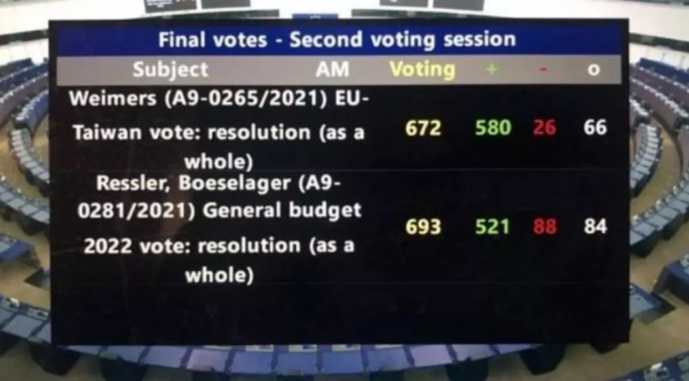欧洲议会10月21日以580票赞成、26票反对、66票弃权,压倒性通过了首份“欧盟-台湾政治关系与合作”报告。报告呼吁欧盟强化与台湾经贸和科技合作关系,并“强调台湾海峡的军事冲突不仅会造成影响欧洲利益的重大经济混乱,而且会严重破坏该地区基于规则的秩序,以及以人权、民主和法治为核心的民主治理”等建议内容。