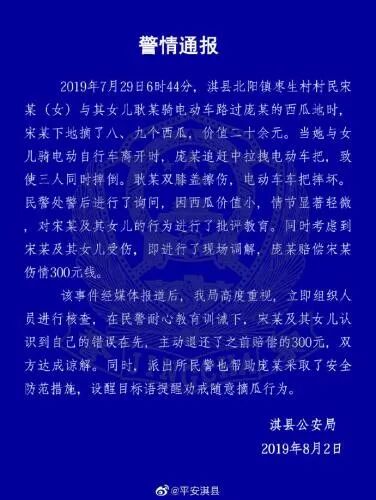 根据淇县公安局官方微博发布的通报,7月29日6时44分,淇县北阳镇枣生村村民宋某(女)与其女儿耿某骑电动车路过庞某的西瓜地时,宋某下地摘了八、九个西瓜,价值二十余元。当她与女儿骑电动自行车离开时,庞某追赶中拉拽电动车把,致使三人同时摔倒。耿某双膝盖擦伤,电动车车把摔坏。